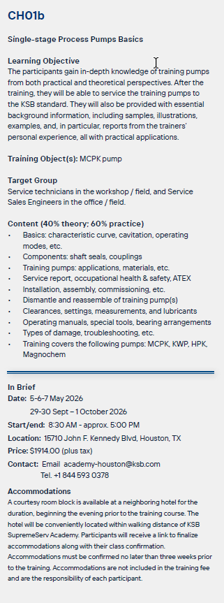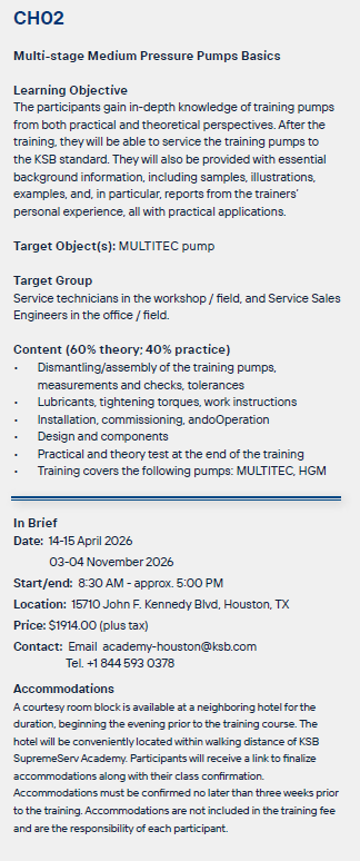 This basic course provides in-depth knowledge of training pumps from both practical and theoretical perspectives using the MCPK pump.