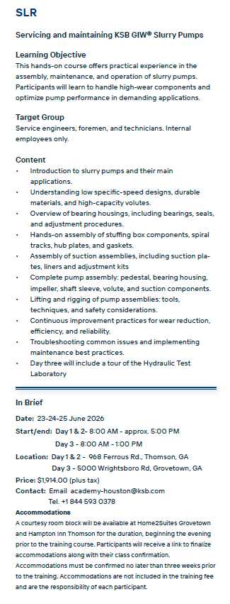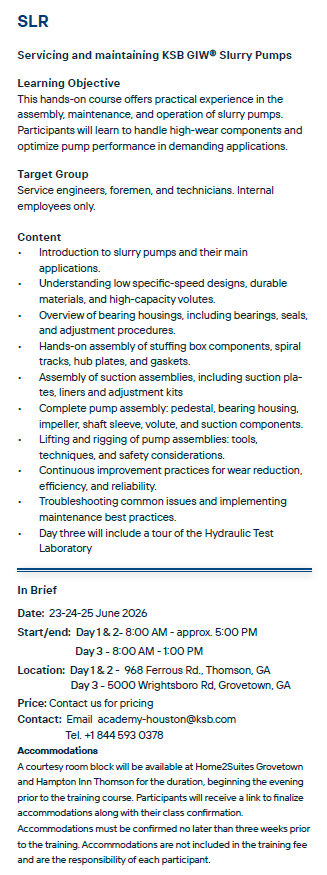 This hands-on course offers practical experience in the assembly, maintenance, and operation of slurry pumps. Learn to handle high-wear components and optimize pump performance in demanding applications.
